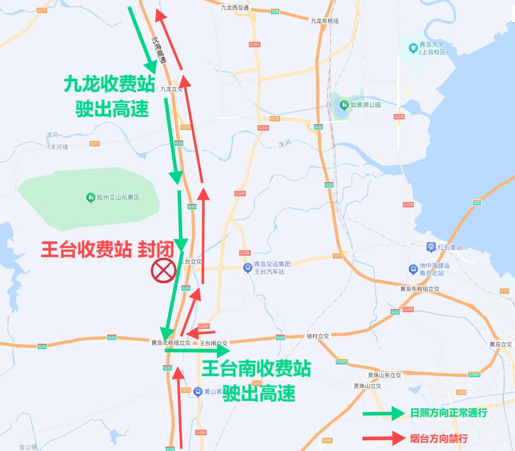2.原本计划从王台收费站行驶的车辆,可以选择G15九龙收费站提前行驶,也可以选择王台南收费站通过黄岛北立交沿着G22青兰高速青岛行驶。