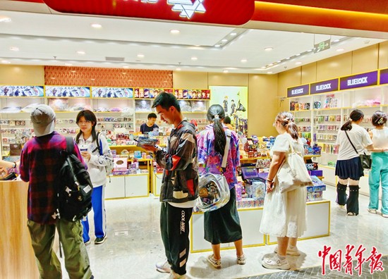 “叮铃铃,叮铃铃…”“哇!是我推!“谷子店”里有很多小铃铛。当顾客“推”(盲盒中喜欢的角色)惊呼时,店员会摇动铃铛,营造出“推”的仪式感。这家“谷子店”的创始人秦晋介绍,谷子店从一开始就注重顾客的感受,希望购买谷子是一个很享受的过程。”“待久了,你会发现,商店里不时传来惊呼或笑声,在这里不管是喜怒哀乐,都能得到片刻的释放。另外,“谷子店”还设立了“谷美区”,顾客可以亲自为“谷子”定制吧唧托、卡套等。商店门口还有人物立牌供顾客拍照打卡。