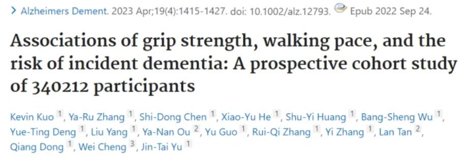 ⑥Kuo K, Zhang YR, Chen SD, et al. Associations of grip strength, walking pace, and the risk of incident dementia: A prospective cohort study of 340212 participants [published online ahead of print, 2022 Sep 24]. Alzheimers Dement. 2022;10.1002/alz.12793.