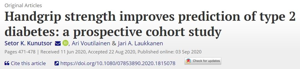 ⑦Kunutsor, S. K., Voutilainen, A., & Laukkanen, J. A. (2020). Handgrip strength improves prediction of type 2 diabetes: a prospective cohort study. Annals of Medicine, 52(8), 471–478.