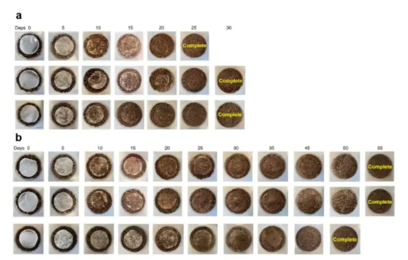 ▲土壤中“活”塑料的降解过程 a.在土壤中30天后,“活”塑料可以完全降解;b.普通PCL塑料在土壤中完全降解55天。图片/参考文献[1]