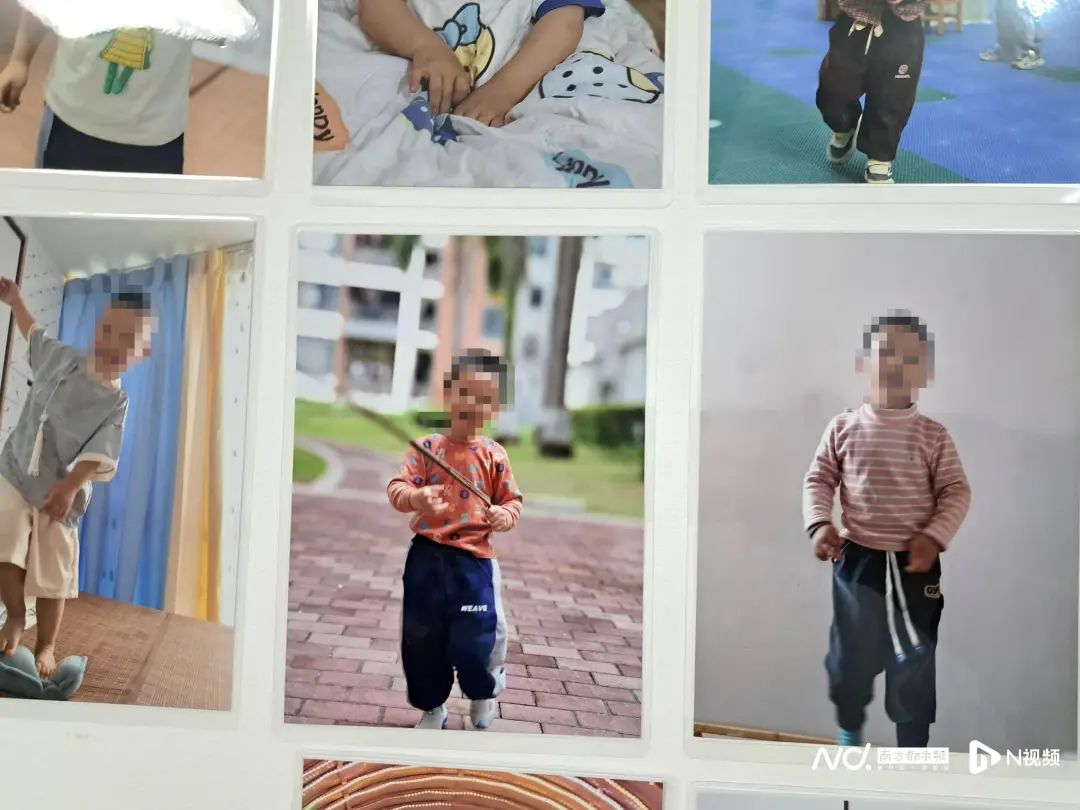 小海坠毁后,妈妈陈女士清理了孩子生前的照片,贴在家里客厅。