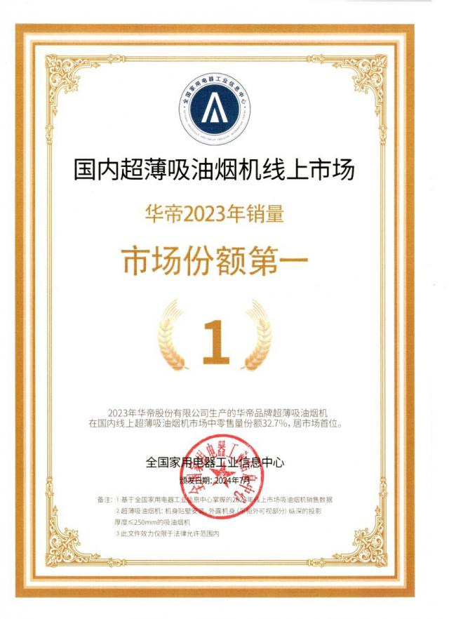 根据国家电气工业信息中心发布的最新市场报告,2023年 2008年,华帝在国内超薄烟机线上市场销量排名第一。