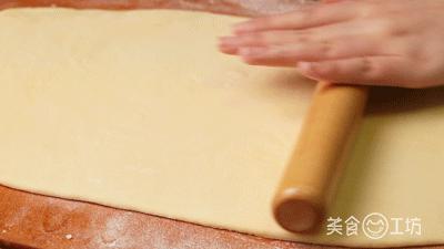 4. 取出发酵好的面团,不排气,直接拍扁,用擀面杖擀成长面,用刀切成 1-2cm 宽条形。