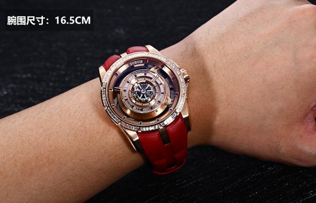 良好的镶嵌工艺,通过嵌入大师的技艺,可以使裸钻和晶石在手表上最大限度地提高自然光泽。从银河之眼的实物效果来看,为什么手表上长方形、梯形切割钻石的最佳搭档被公认为嵌入轨道? Channel setting?由于贵金属外壳首先上车出管沟,然后将晶石放入管沟中,所有晶石的腰边都在槽内,只露出台面和亭台楼阁的嵌入方法。优点是坚固,钻孔和钻孔看不到任何间隙,也不会像传统的爪子和包子一样露出圆珠或包边,结合矩形切割会凸显裸钻的线条美感。但这种嵌入式组合,也并非十全十美,其缺点是对工匠的嵌入技艺要求很高,而且, RD 使用的钻石个头很大,加工难度随之增加,但也难不住罗杰杜彼,最后, RD 于是,凭借裸钻的美感,成功地吸引了人们在陀飞轮上的注意力。