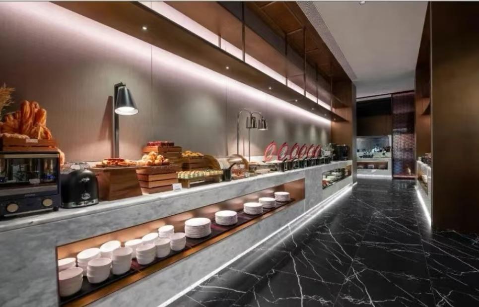 据悉,国展城际酒店拥有104间客房,每间客房配有挂耳咖啡、德国自酿啤酒和迷你酒吧,以满足居民“早C晚A”的需求,在商务谈判和放松休息室自由转换,还配备了24小时健身房、自助洗衣房、全日制餐厅、酒吧等多种功能空间。
