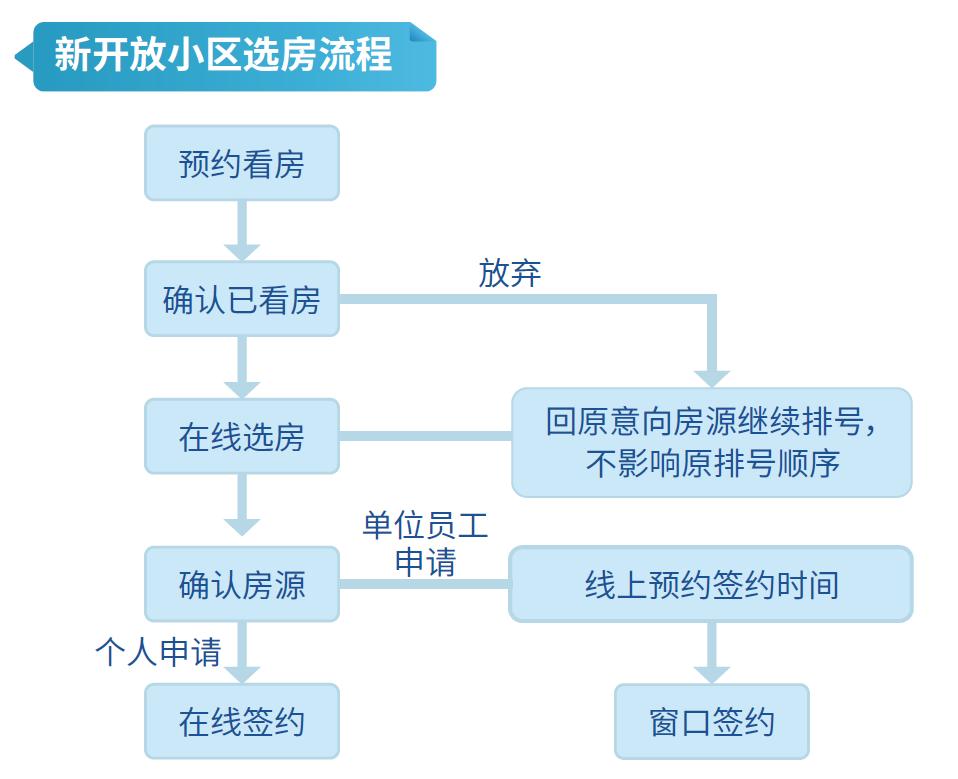 开放新社区选房规则:所有等待状态的申请人都可以在开放看房期间预约看房“用户中心-预约看房-预约看新社区”,看房后完成“用户中心-预约看房-完成选房”的确定。网上选房时间去“网上选房-新开放社区”网上“选房”。