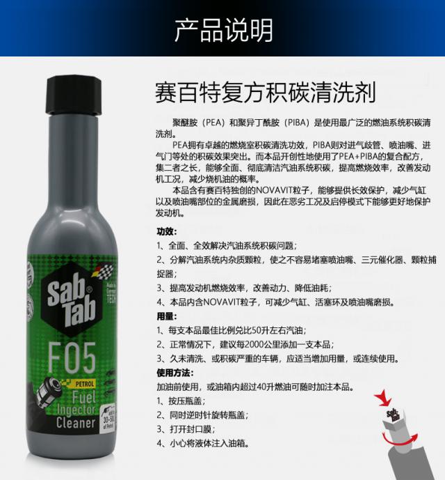 与大家分享我们的内容赛百特 F05 燃料添加剂,开创性地使用 PEA PIBA 采用复合配方,将燃油系统积碳全面、深度清洗,提高燃烧效率,改善发动机工况,降低燃烧机油的发生率。