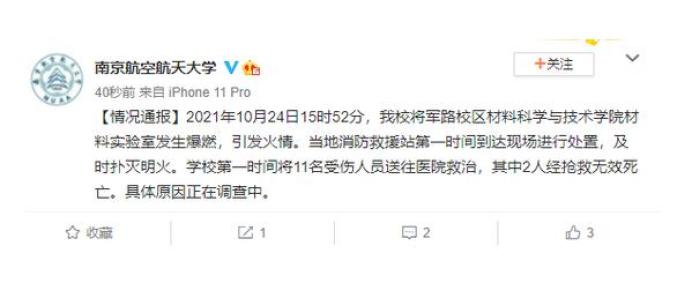 江苏南京航空航天大学一实验室于2021年10月24日爆炸,引发火灾。