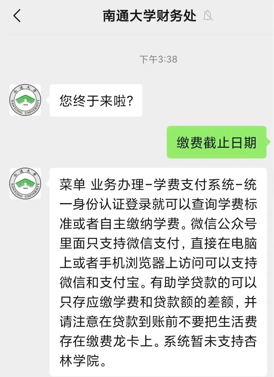 ▲南通大学财务部微信公众号回复截图。图片/社交媒体截图