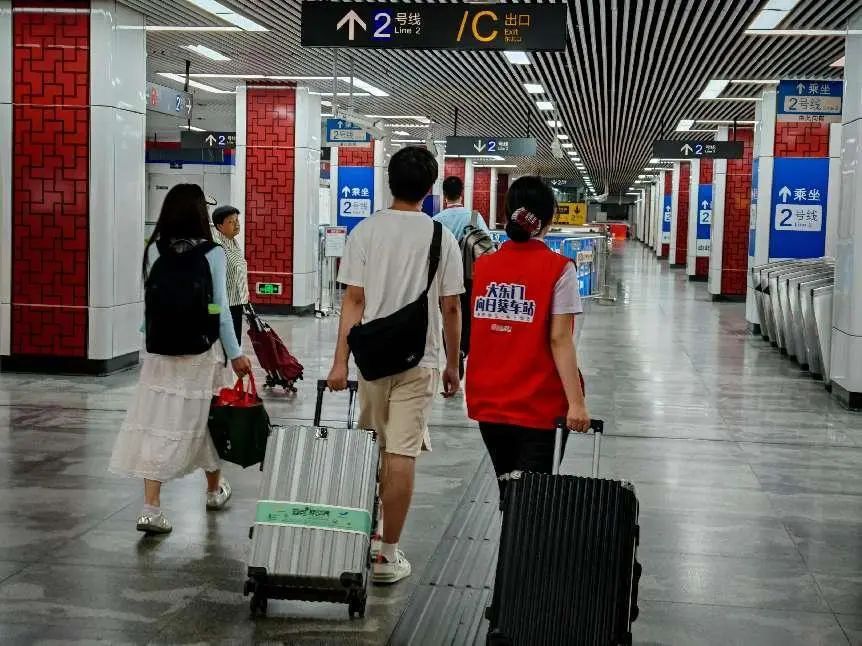 合肥轨道在合肥火车站、合肥南站设立“大学迎新服务站”和包队。在出入口大门、自动扶梯、楼梯等关键位置进行安全宣传和引导,引导学生快速离开车站。针对学生和乘客普遍携带大行李箱的出行情况,积极帮助学生拿走行李,让肥学生和家长在地铁上出行方便、顺畅、舒适、温馨。