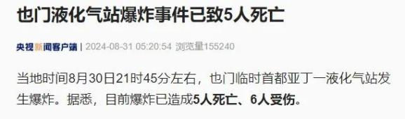 当地时间8月30日21时45分左右,也门临时首都亚丁一液化气站爆炸。据悉,目前爆炸造成5人死亡,6人受伤。