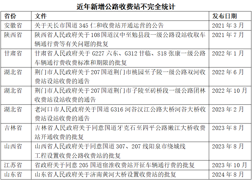 国家发改委国土发展与区域经济研究所副研究员李沛霖等人整理了近年来新增公路收费站的不完全统计表。从图中可以看出,自2021年以来,安徽、山西、甘肃、湖北、吉林、陕西、江苏、山东都发布了开通国道收费站收费的通知。