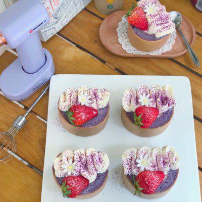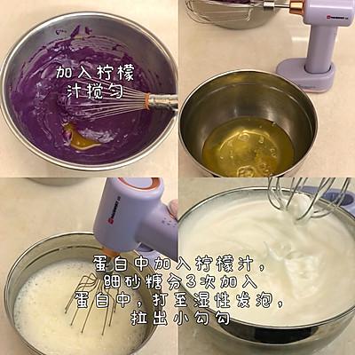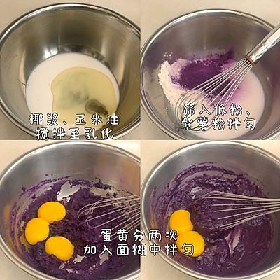 1、1 ⃣️、将椰奶、食用油搅拌至乳化。 2 ⃣️、筛入低粉,紫薯粉搅拌均匀。 3 ⃣️、在面糊中加入蛋黄两次搅拌均匀。