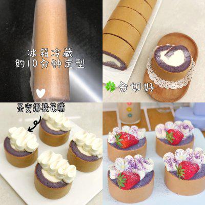 5、,卷好的蛋糕卷放在冰箱里冷藏。 10 分钟定型。 再此外打 140 克淡奶油装饰,随意装饰~