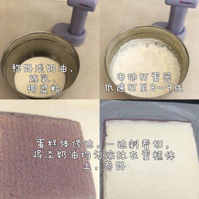 4、8 ⃣️、将淡奶油、细砂糖、椰奶粉称为盘内,电动打蛋器低速送至 8~9 成。 9 ⃣️、饼体修边,斜切,将打好的淡奶油均匀涂抹在饼体上,卷好。