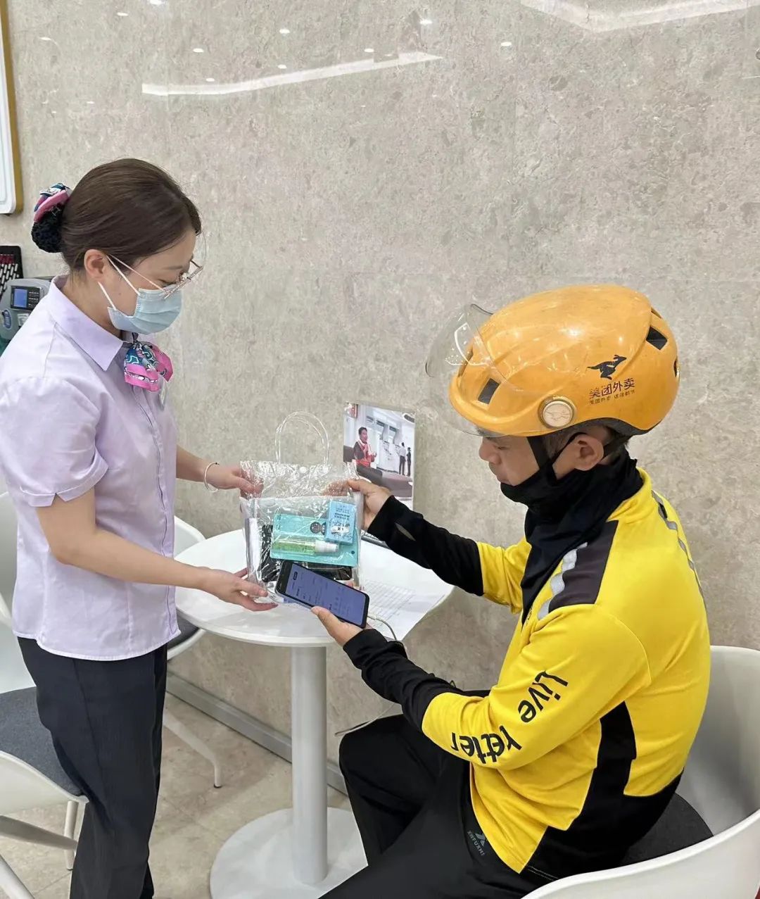 他说:“这儿可以纳凉休息,还准备了免费饮用水。"进入农业银行松江塔汇分行歇脚的环卫工人非常感谢农业银行的贴心服务。据了解,为了进一步帮助这些新市民全方位融入城市生活,中国农业银行上海松江支行辖区内所有网点都设立了“农情暖域”,为外卖骑手、快递员、施工人员、环卫工人等户外劳动者提供休息降温、食物加热、手机充电、免费饮用水等热心服务。