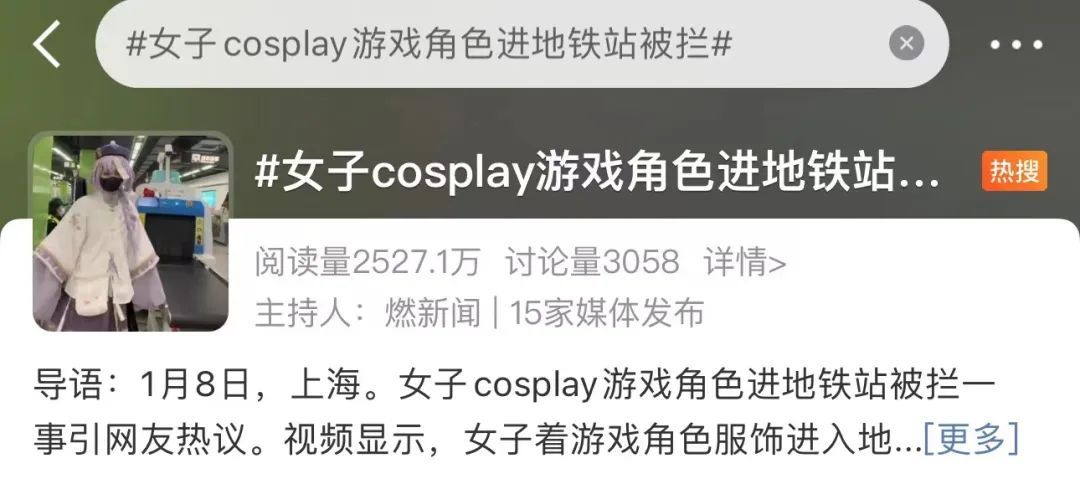 接着,相关话题冲上热搜。不少网友表示:只要没有恐怖装扮,支持coser进入地铁↓