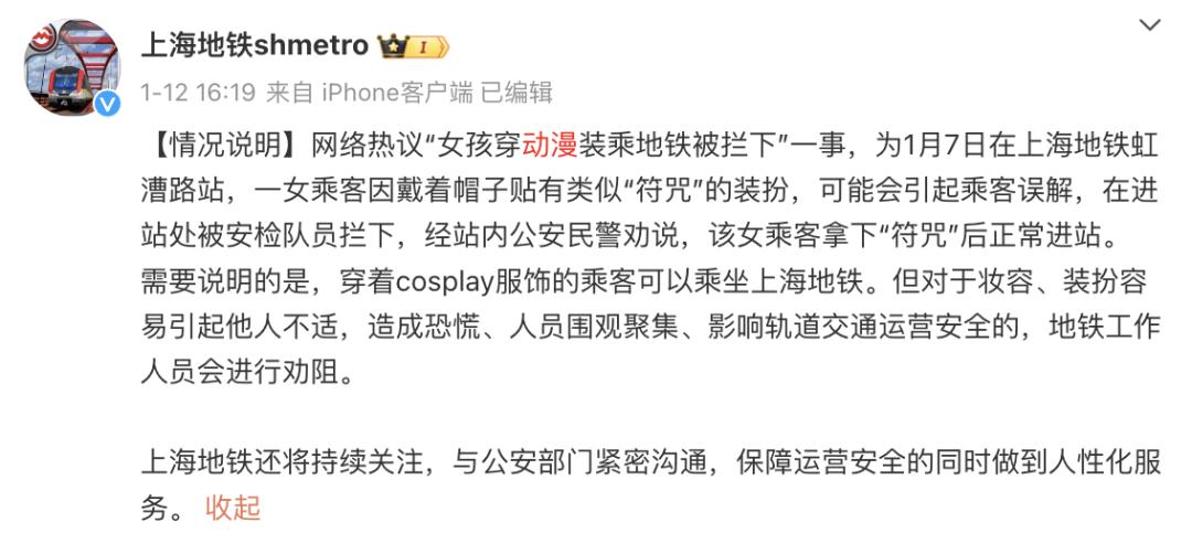 2024年1月,上海地铁回应“女生穿动漫服坐地铁被拦”。其中,穿cosplay服装的乘客可以乘坐上海地铁。但地铁工作人员会劝说化妆和打扮容易引起他人不适,导致恐慌、人员聚集、影响轨道交通运行安全的人员。