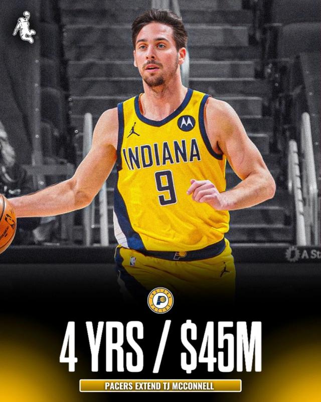 北京时间 9 月 1 日本,步行者正式宣布:球队正式续签 TJ- 麦康奈尔。ESPN 补充报道,双方签署了一份报告。 4 年 4500 续约合同万美元。原来的麦康奈尔合同还剩下 1 年 930 一万美元,续签后相当于一万美元 5 年 5400 万美金,2029 只有年夏合同才能到期。