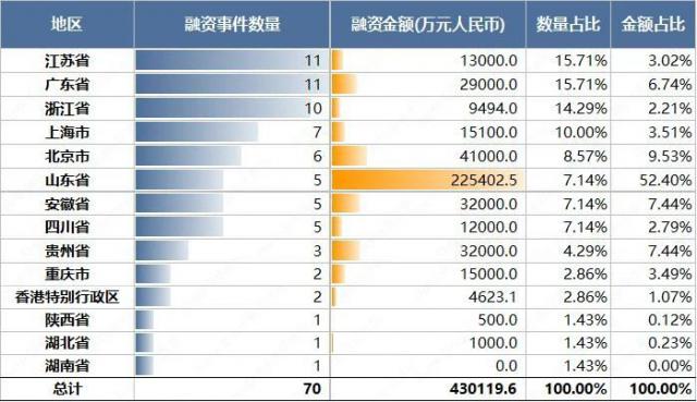 本周地理分布方面,江苏省、广东省、浙江省、上海市、北京市是融资事件数量前五的地区,前五地区总融资事件发生。 45 起初,占所有融资事件总数的总和。 区域集中度比上周下降64.28%。 26 %。融资金额方面,本周前五地区为山东省、北京市、贵州省、安徽省、广东省,前五地区融资金额总额。 35.94 占全部融资总额的亿元 与上周相比,地区集中度降低了83.56%。 9 %。