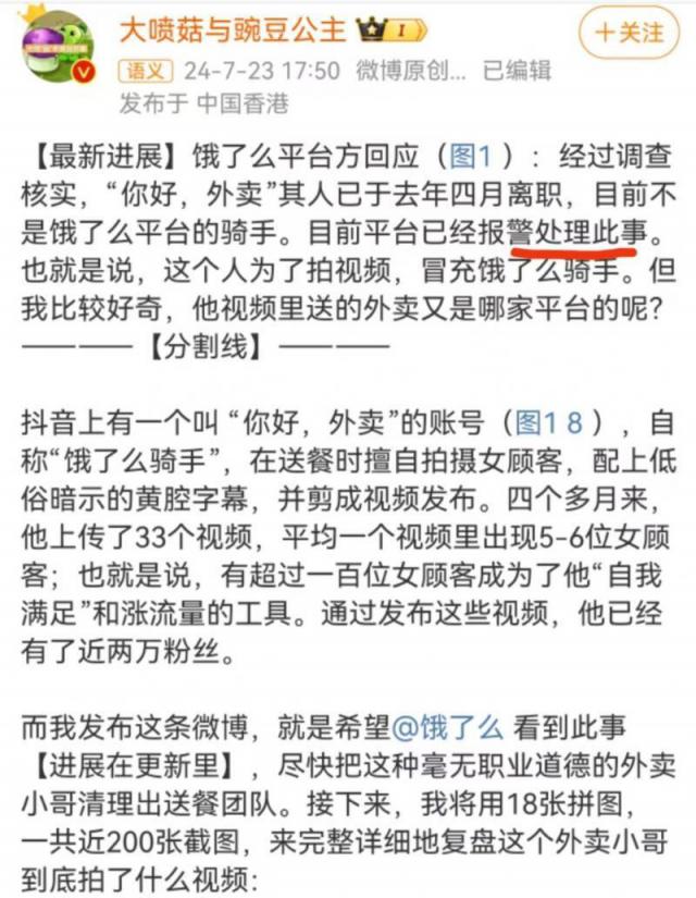 接着,饿了么平台回应说:“你好,外卖”骑手去年已经辞职,现在不是平台骑手,平台也已经报警处理此事。