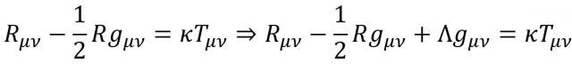 唯一能同时满足模型要求的方法就是在方程中加入所谓的“宇宙常数”,这个数字使用希腊字母。Λ表示。修改后的广义相对论场方程如下 [ 5 ]