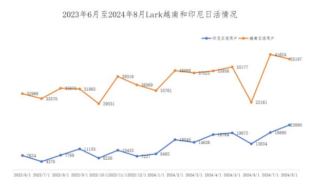 Lark可能也意识到了这些问题,并专注于东南亚的越南和印尼市场。在越南市场,Lark的日常用户在过去一年中保持在3万左右,而一些日常用户在一些月份保持在4万以上。在印尼市场,Lark的日常用户从去年6月1日的7624稳步增长到今年8月1日的23890。