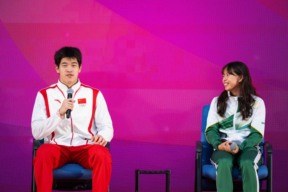 九月一日,游泳运动员潘展乐(左)在活动中回答了澳门运动员的提问。新华社记者 张金加 摄