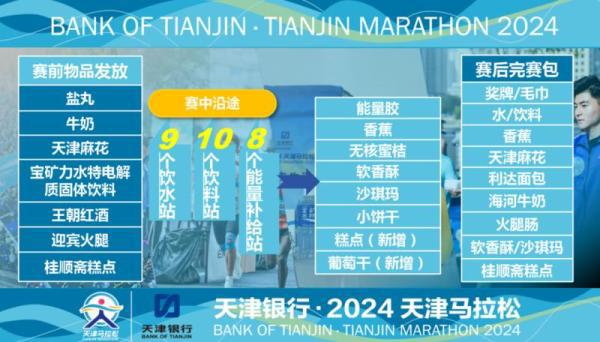为了帮助选手顺利完成比赛,今年的跑道沿线已经设置好了。 9 个饮水站、10 个饮品站和 8 一个能量供应站,并为玩家提供能量胶、香蕉、无籽橘、软脆、沙琪玛、饼干和新添加的能量胶。 1 至 2 各种补充材料。赛前领事现场,选手可获得盐丸、牛奶、天津麻花、宝矿力水特电解质固体饮料、王朝红酒、迎宾火腿、桂顺斋小吃等补充。比赛结束后,比赛包配备了奖牌、毛巾、水、饮料、香蕉、天津麻花、利达面包、海河牛奶、香肠、软脆、沙琪玛、桂顺斋小吃等物资。
