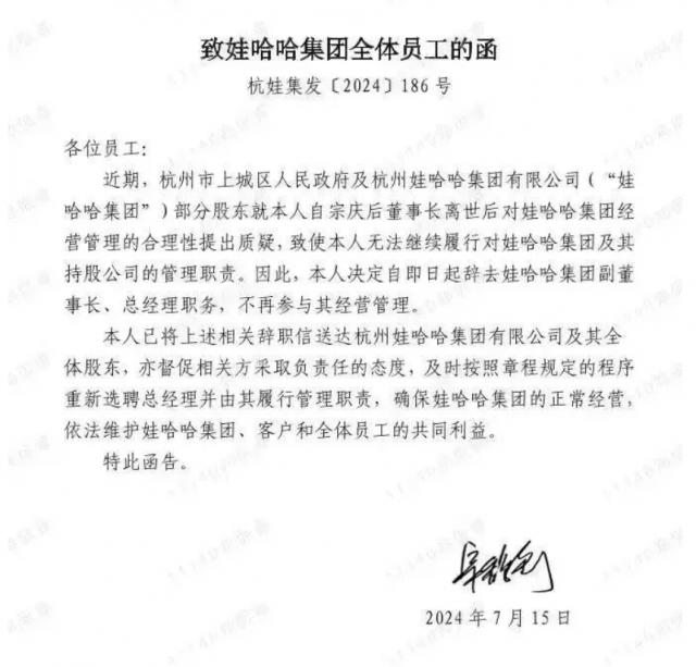 值得注意的是,在此之前,网上流传着一封名为宗馥莉的“致娃哈哈集团全体员工的信”。函中提到,宗馥莉决定从即日起辞去娃哈哈集团副董事长、总经理职务,不再参与其经营管理,因为娃哈哈集团部分股东对宗馥莉自宗庆以来董事长去世后对娃哈哈集团经营管理的合理性提出异议,宗馥莉决定辞去娃哈哈集团副董事长、总经理职务。