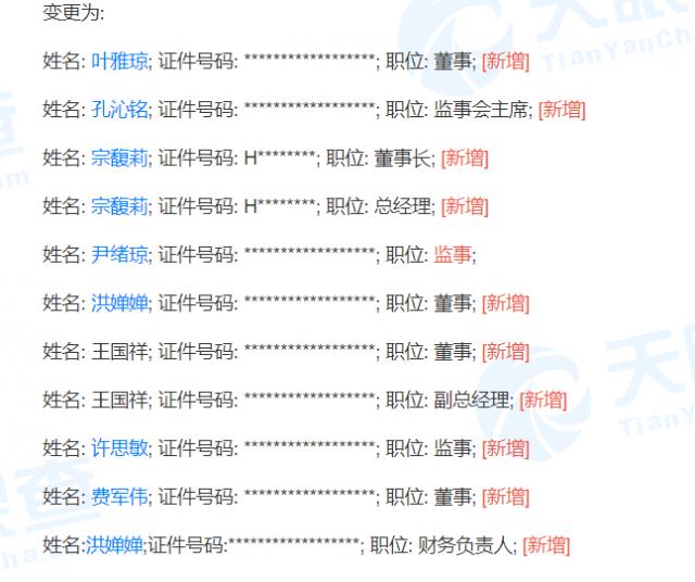 与此同时,随着宗馥莉接手娃哈哈,娃哈哈也进行了一系列的人员调整。许多高管,如张晖和吴建林,退出了董事和监事的职位,增加了叶雅琼和费军伟作为董事,王国祥作为董事和副总经理。