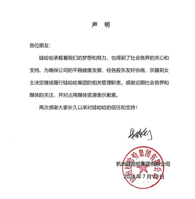 随后,娃哈哈官网发表声明称,宗馥莉女性决定继续履行娃哈哈集团的相关工作职责,以确保公司的稳定健康发展。娃哈哈表示,感谢社会各界和媒体最近的关注,并为占领网络媒体道歉。