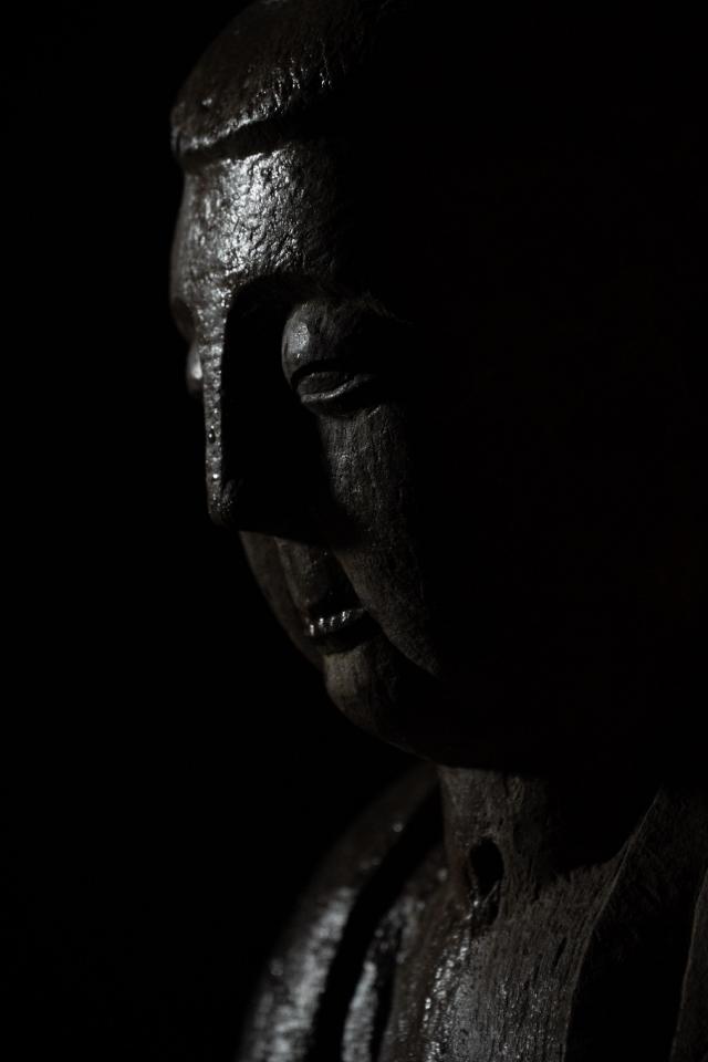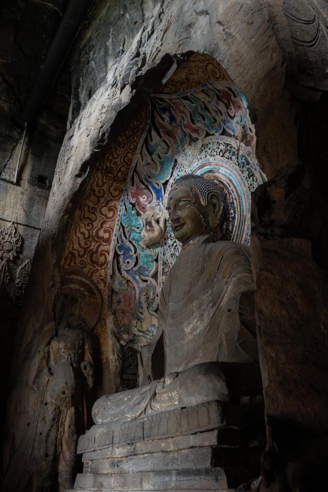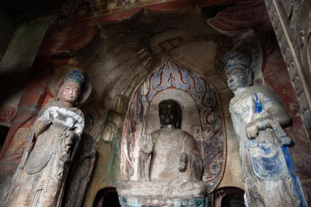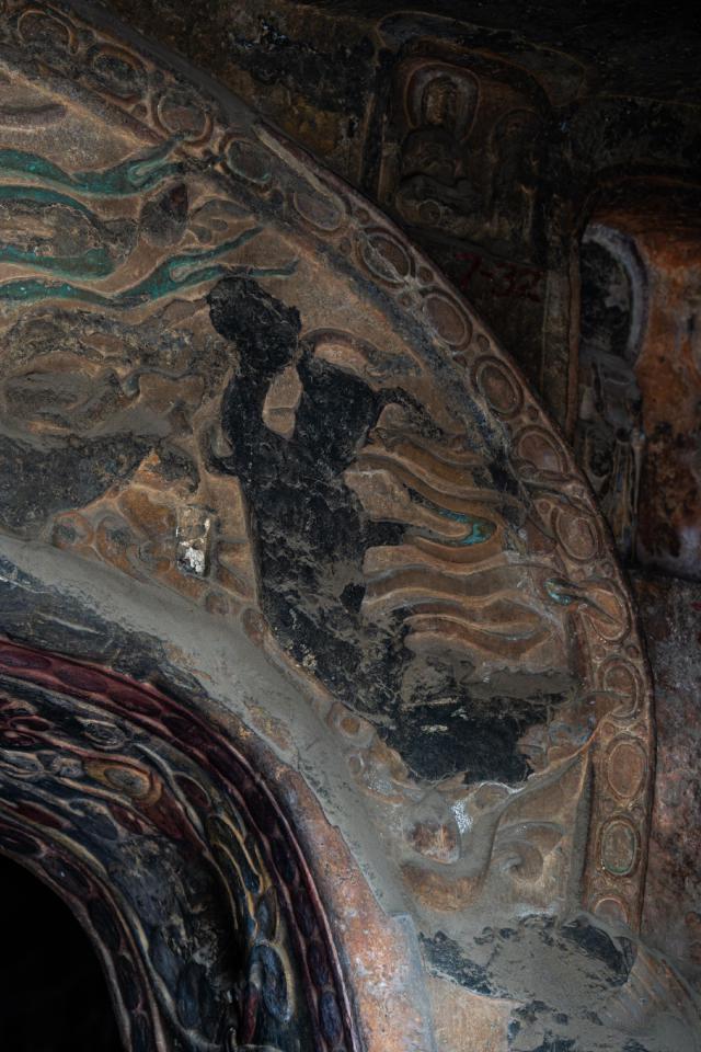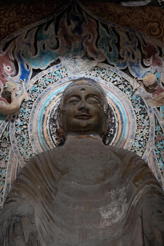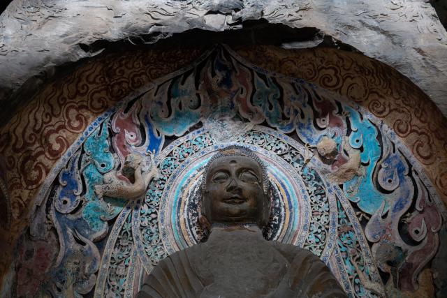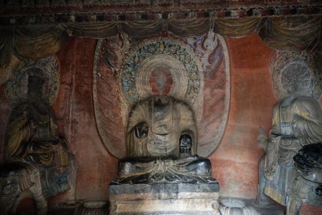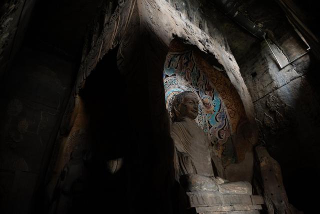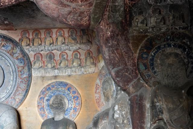 石窟特别安静,只有游客小心翼翼的脚步声,偶尔会有导游的解释声萦绕在山洞里。我在大佛洞里走来走去,寻找拍摄角度,通过取景器观察每一个细节。背光的绘制,外壁雕刻的宝藏图案,隐藏在黑暗中的大大小小的佛龛,都令人惊叹。