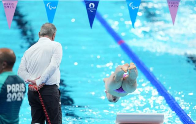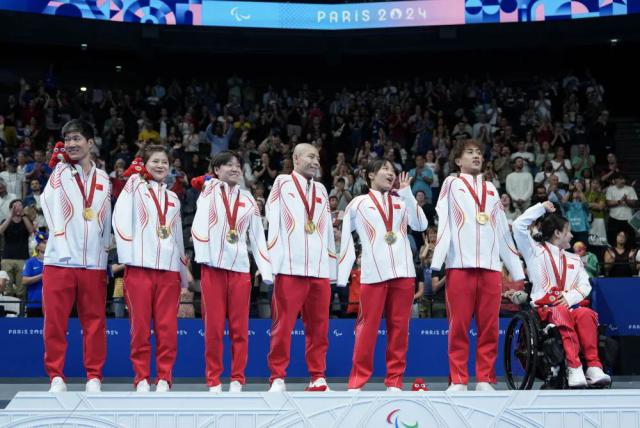新华社巴黎 8 月 30 30日电(记者马思嘉、张薇) 巴黎拉德芳斯体育馆,巴黎残奥会男女混合体育馆, 4X50 大米自由泳接力 20 决赛开始了。中国队最后一名球员吸引了很多目光。——他没有戴泳帽,剃光了头,到达终点时用头撞到了侧墙,为中国队锁定了金牌,并以头撞到了侧墙。 2 分 14 秒 98 美国队领先世界纪录,排名第二。 4.01 秒。
