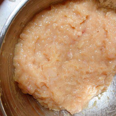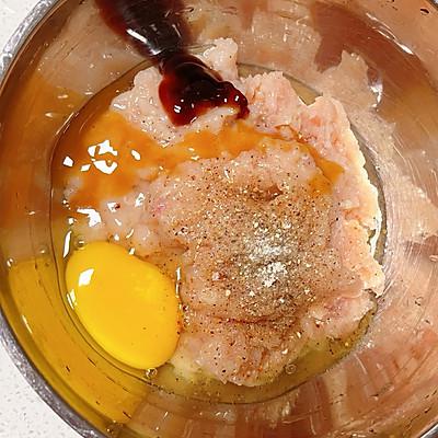 1、将鸡胸肉剁成泥,放入鸡蛋,耗油,黑胡椒海盐,鸡汁