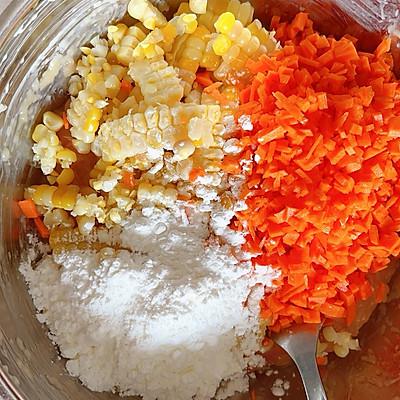 3、熟玉米切玉米,胡萝卜切丁,放入淀粉中