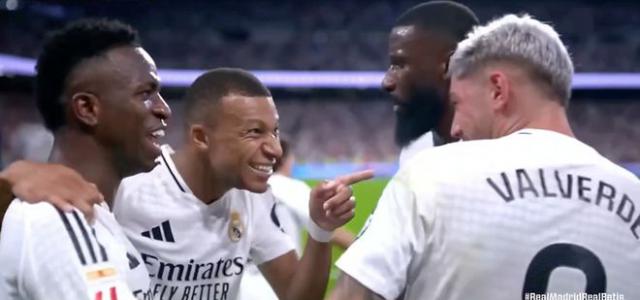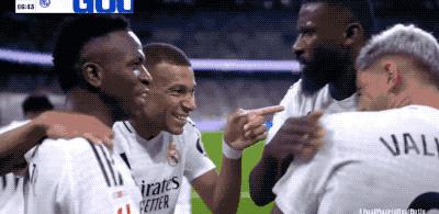 姆巴佩进球后非常激动,他指向巴尔韦德,维尼修斯也跑过来,三人紧紧地拥抱在一起。