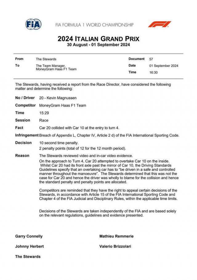 北京时间 9 月 1 日,F1 蒙扎站比赛结束后,哈斯队的车手马格努森在这场比赛中因超车而遭遇碰撞。 FIA 处以 2 罚分,到目前为止,马格努森的超级驾照今年已经被罚满了。 12 得分,他在巴库的下一场比赛中被禁赛。