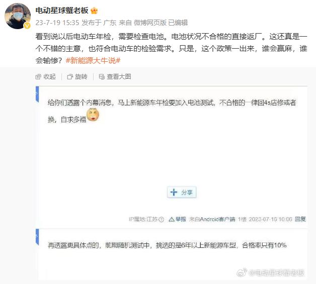 有博主在去年爆料「电瓶车年审」时提到,超过6年的新能源汽车,只有10%的随机检验达标率。