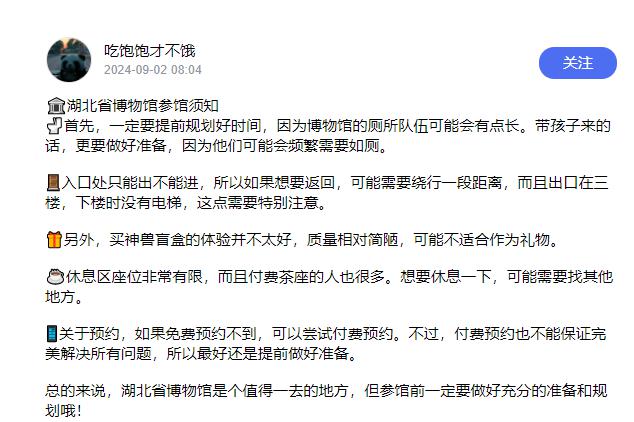 � � 至于预约,如果不能免费预约,可以尝试付费预约。但是,付费预约并不能保证所有问题的完美解决,所以最好提前做好准备。 总体而言,湖北博物馆是一个值得一游的地方,但是在参馆之前一定要做好充分的准备和计划哦!