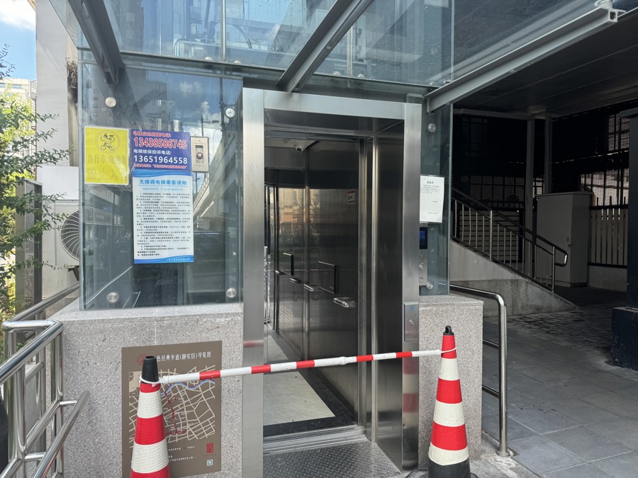 江苏省北路长宁支路交叉口天桥东侧电梯正在维修中。