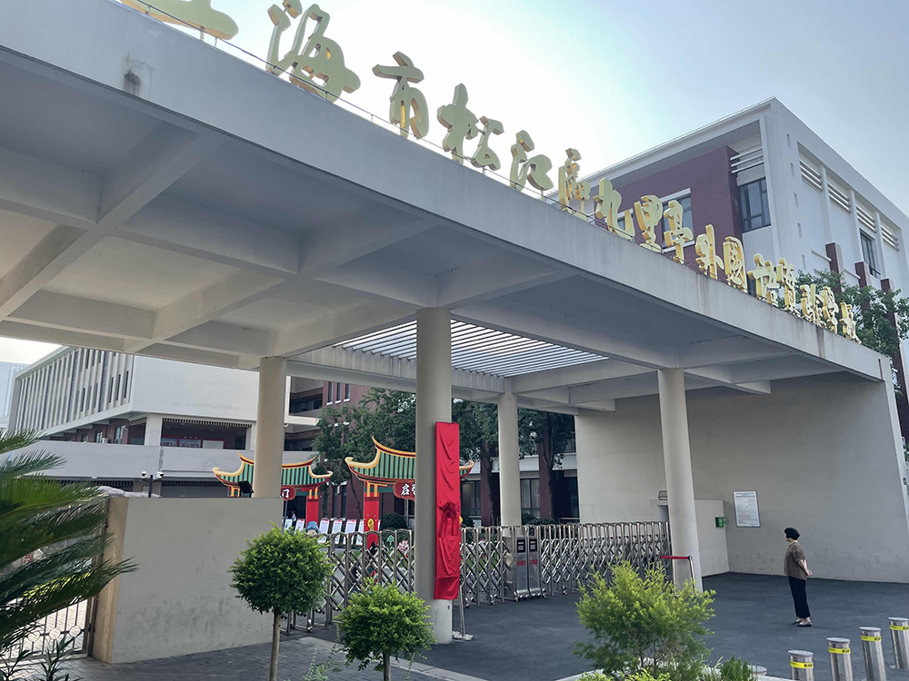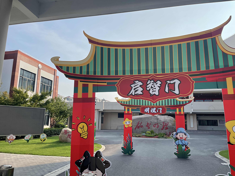 那天,澎湃新闻(www.thepaper.cn)记者来到上海市松江区九杜路100号九里亭外国语实验学校。进入大门后,薄板上的红色拱形门映入眼帘。第一扇门和第二扇门都写了“启蒙门”和“知识门”来迎接新生。充满仪式感的“入学门”为新学期增添了活力。