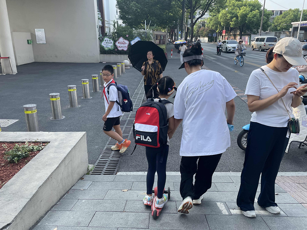 一些低年级的父母把电动车停在阴凉的地方,把豆浆、油条等早餐塞给孩子,让孩子吃完早餐再进去。他们还告诉孩子好好上学。有些父母穿着通勤服,一只手拿着两个大包,另一只手抱着孩子。送孩子上学后,他们匆忙去上班。