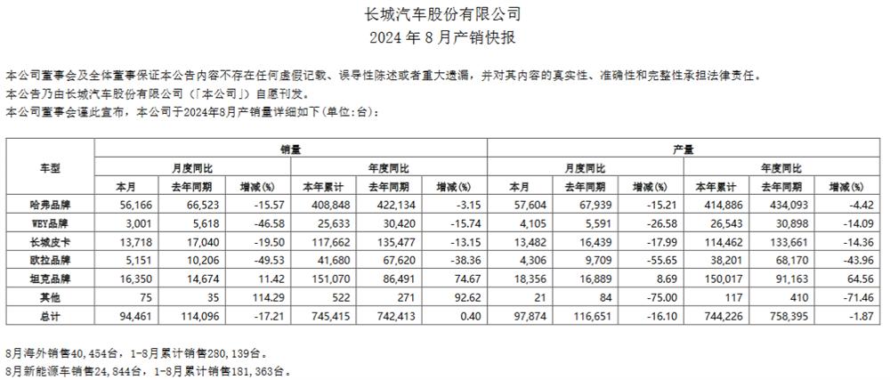 8月份长城汽车销量9.4万辆,新能源汽车销量2.5万辆。虽然环比依然稳定,但长城也是8月份唯一销量同比下降的汽车公司,比去年同期下降了17%。