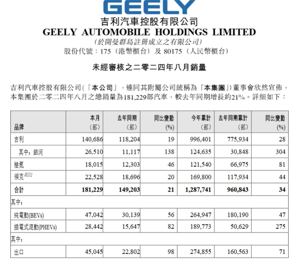 吉利集团8月份销售18.1万台,环比增长20%以上,同比增长21%左右。与此同时,吉利8月份出口海外4.5万台,环比增长39%以上,同比增长98%左右,同样令人眼花缭乱。