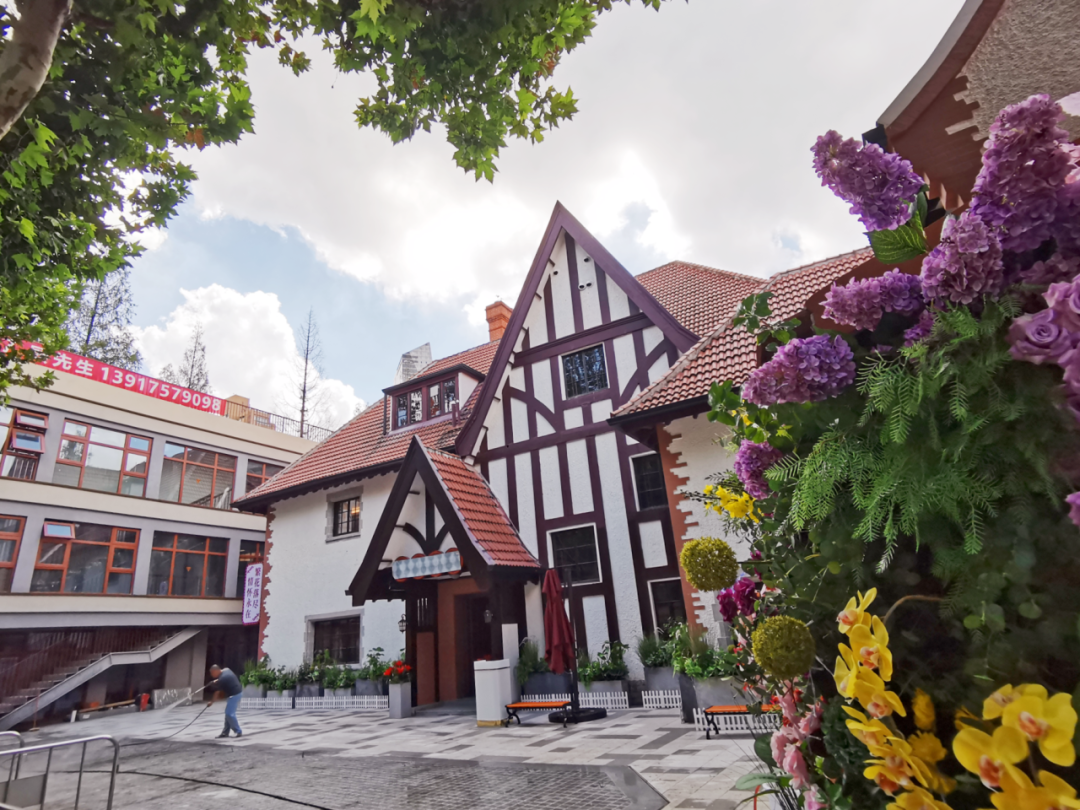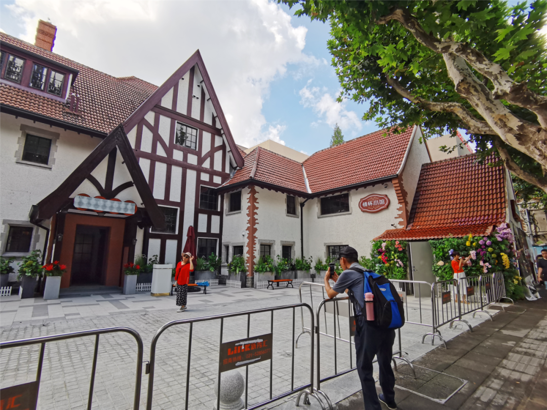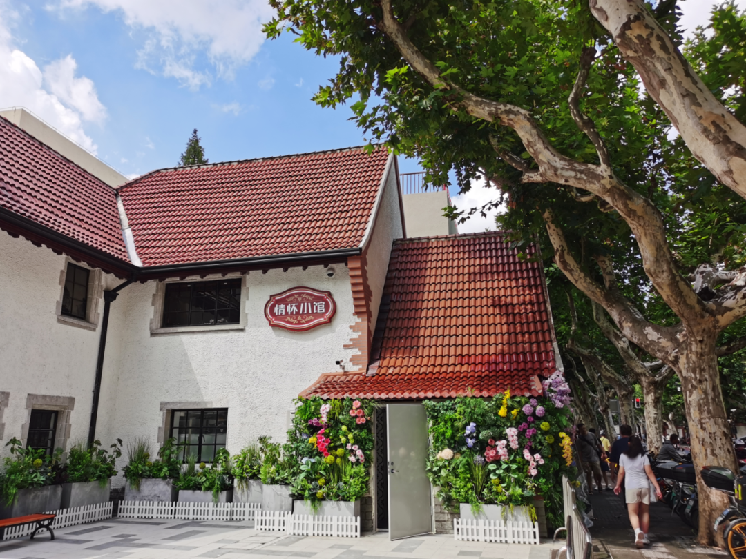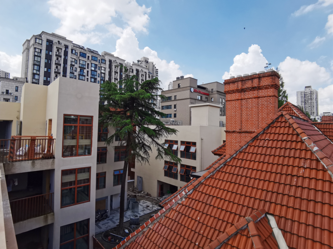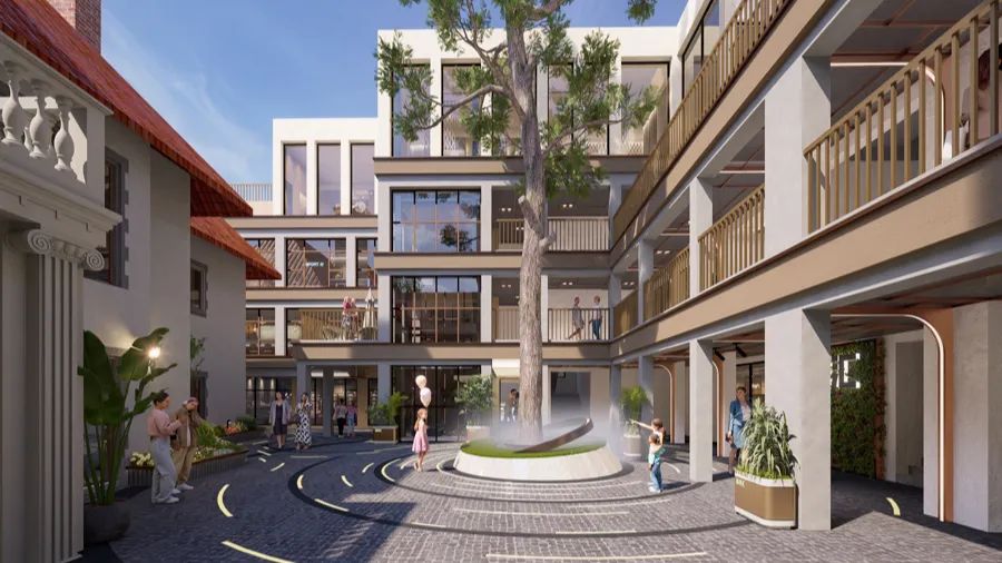 位于“C位”1号楼,在模拟花墙的点缀下,尽显优雅,吸引了众多市民停留。它是一种砖木混合结构,道路、墙壁、屋梁等均采用保护性整修。2、3号楼均为4层楼高的改造建筑,现代设计风格简洁低调,与“静雅武夷”的气质十分契合。从二号楼到天台区,望向武夷路,可以看到“洋房众多,梧桐掩映”的美景。如果你把目光转向项目内部,你可以看到一棵高大的迎客松。它的小广场区域正在推进结束施工,种植绿色植物和花卉,布局气氛灯带。