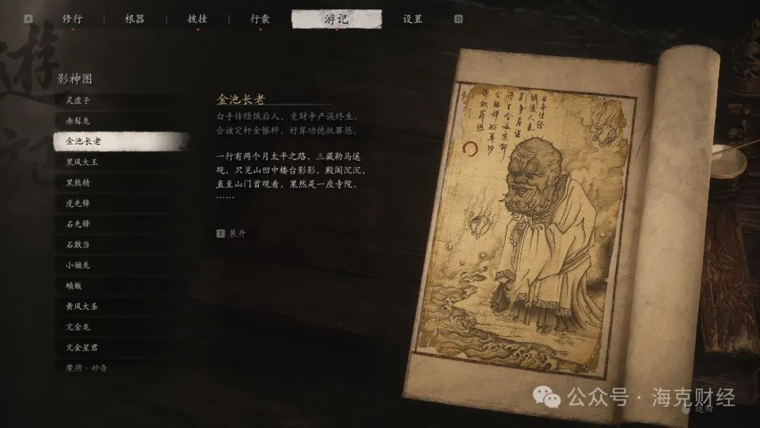 根据海克财经的观察,《黑神话:悟空》中的每一个怪物都有一个小故事,里面包含了人物诗和相应的故事;有的怪物小传出自《西游记》原著,有的则是游戏设计师再编一遍,一般怪物小传中隐藏着大量的故事。