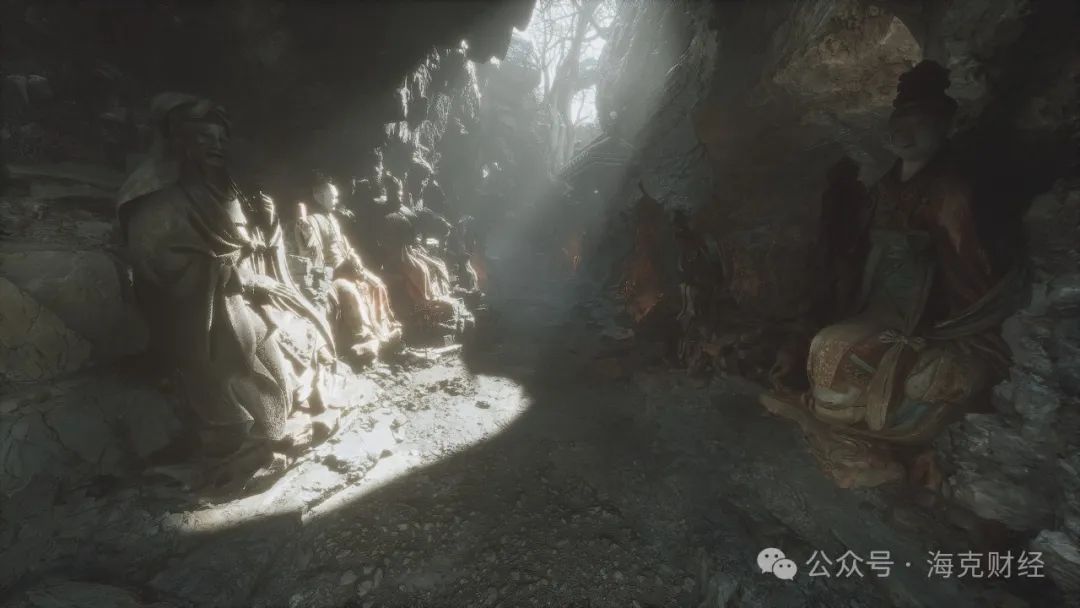 UE5具有极强的渲染能力,包括Lumen全局照明系统,可以实时响应动画场景的光源变化。《黑色神话:悟空》中令玩家惊叹的场景光影诞生了。根据海克财经的观察,《黑色神话:悟空》中的大部分场景都可以与物理世界的照明变化相媲美,比如古寺、庭院、洞穴、树林斜上方照射的光线产生的丁达尔现象,以及人物和物体表面光线的不同运转。