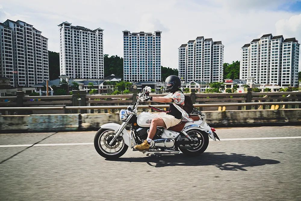 光源从侧面直射,身影在另一端。侧光可以体现照片的整体色彩和立体感。一辆英俊独特的摩托车在路上的窗外并行行驶,快速捕捉到这个英俊的瞬间。由于车辆在同一个地方行驶,一系列的拍摄操作必须在相遇的瞬间完成。尼康Zf的参数调整拨盘一目了然,可以让我以极快的速度调整拍摄参数。难得遇到并列驾驶的拍摄,所以一定要准确对焦。因为大家的行驶速度都是相互移动的,路面上有动感模糊,而远处的建筑清晰,可以算是成功拍摄的一个。